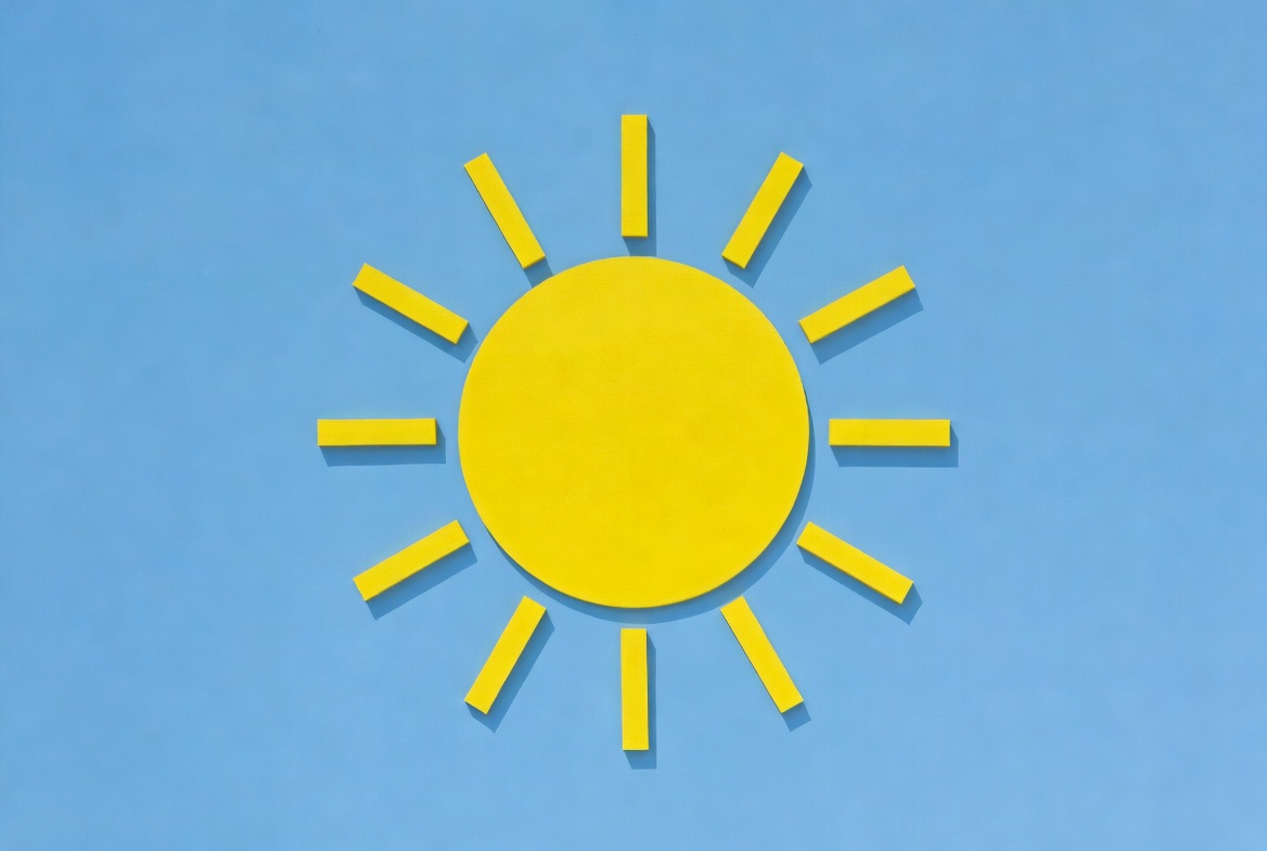 A bright yellow sun with radiating rays is centered on a solid blue background. The sun and rays appear as simple cut-out shapes in a flat design style. It is isolated against the vibrant blue sky-like backdrop.