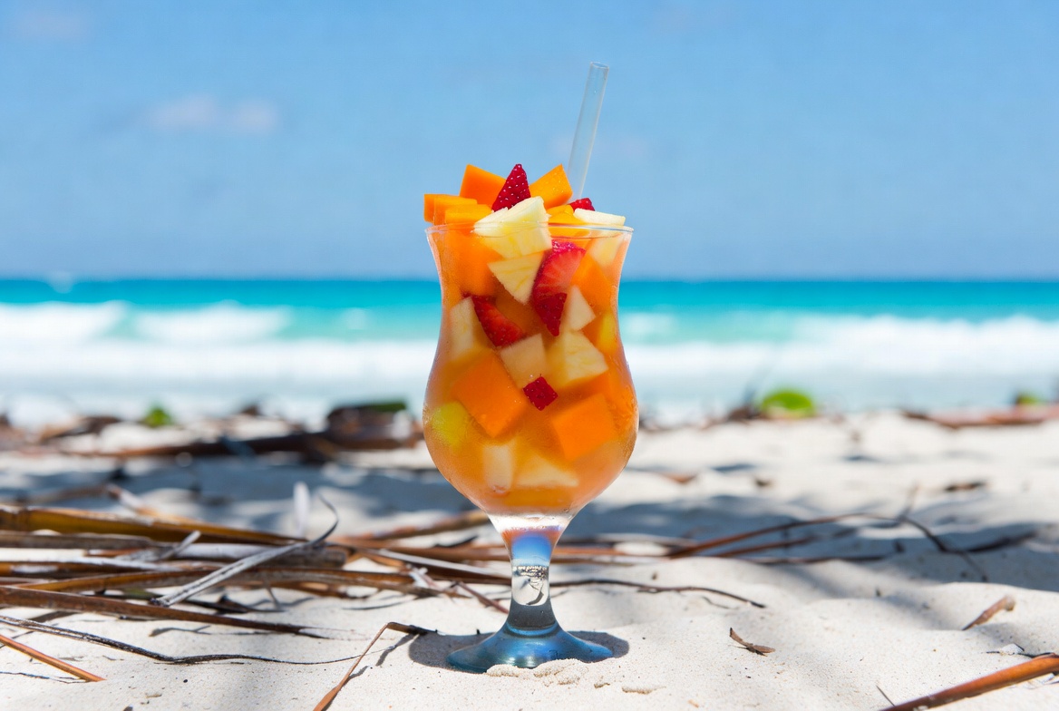 beach, beach drink, blue sky, cocktail glass, diced fruit, fresh fruit, fruity beverage, hurricane glass, isolated background, mango, ocean, paradise, pineapple, refreshment, seaside, straw, strawberries, summer, tropical drink, turquoise water, vacation, watermelon, white sand, fruit cocktail