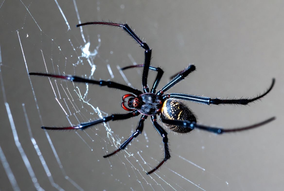 A redback spider with a shiny black body and distinctive red markings on its abdomen sits in the center of a delicate web. Its long, thin legs spread out across the strands, and the spider faces forward with prominent red eyes visible. The web is suspended against a neutral gray background.