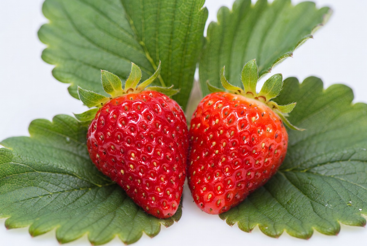 berry, calyx, fresh fruit, fruit, green leaves, isolated, juicy, produce, red strawberries, ripe strawberries, seeds, strawberry fruit, strawberry leaves, two strawberries, white background, strawberries
