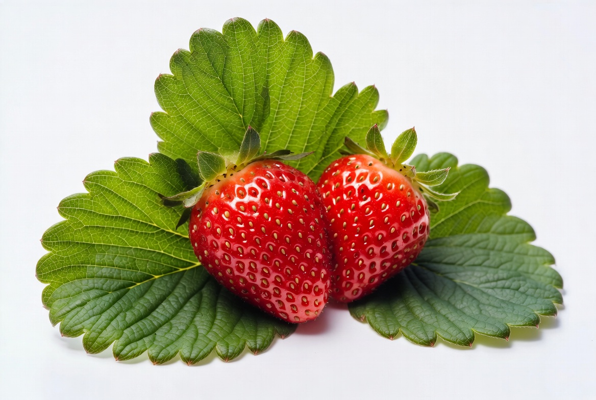 berry, food, fresh berries, fruit, green leaves, isolated background, juicy strawberries, leaves, produce, red fruit, red strawberries, ripe fruit, seeds, strawberry, strawberry leaves, strawberry plant, two strawberries, white background, strawberries