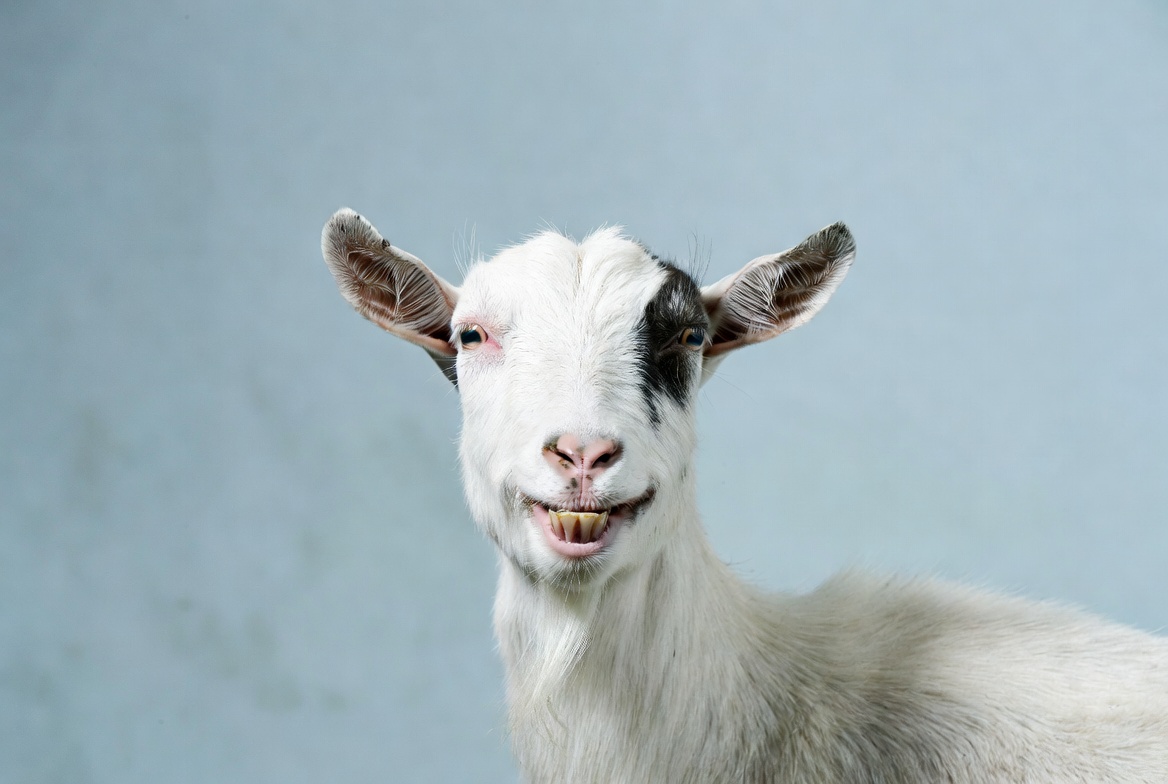 animal portrait, black markings, blue background, cute goat, erect ears, farm animal, fluffy fur, isolated background, livestock, pink eyes, smiling goat, teeth smile, white goat, goat