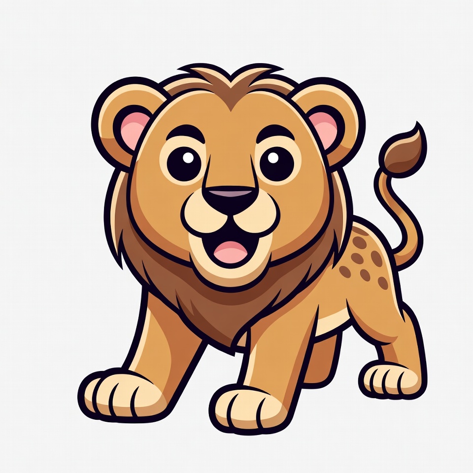 A playful cartoon lion cub stands on all fours with big expressive eyes and a wide smile. It features fluffy brown fur, spots, and a tufted tail. The illustration is vibrant and isolated on a white background.