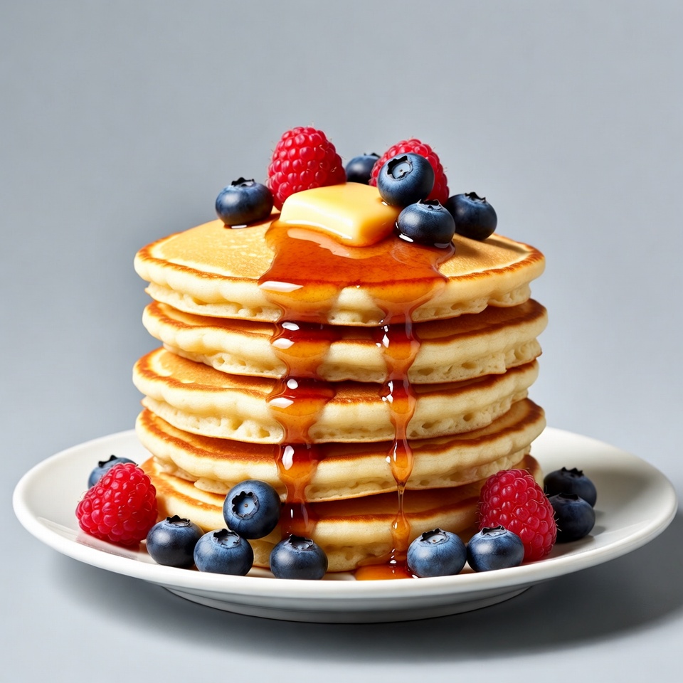 A tall stack of golden pancakes drizzled with maple syrup sits on a white plate. Fresh raspberries and blueberries garnish the top and sides. A pat of butter melts on the summit against a plain gray background.