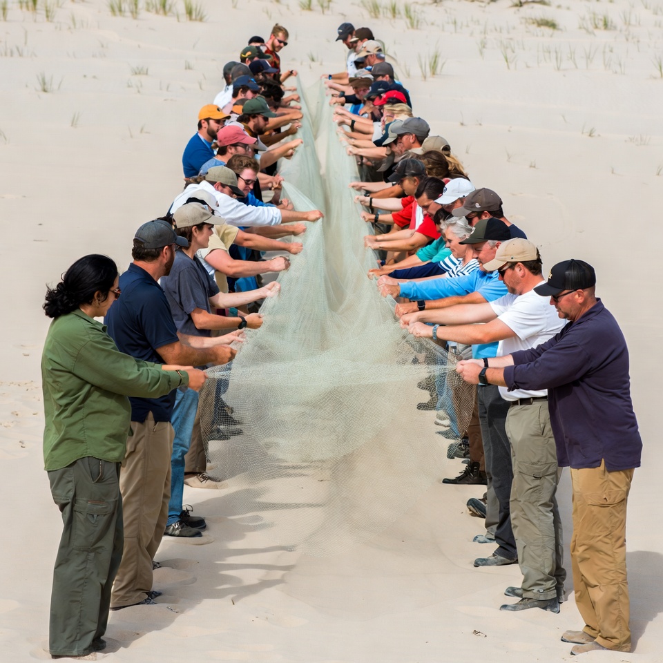 A large diverse group of men and women stands in two lines on a sandy beach, collaboratively pulling a large fishing net between them. They wear casual outdoor clothing including hats, t-shirts, and pants, with arms extended gripping the net. The scene is set against dunes with sparse grass.
