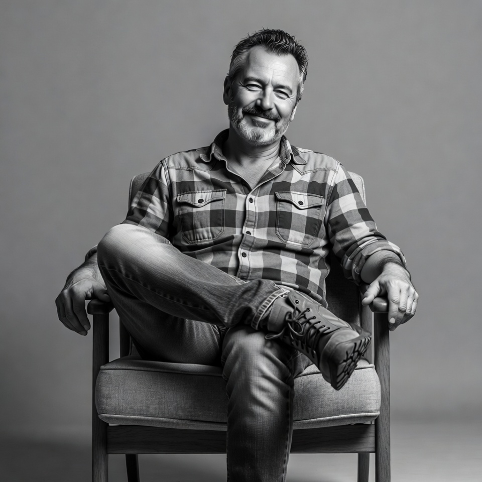 A middle-aged man with short hair and a beard smiles warmly while seated in a wooden armchair. He wears a black and white plaid button-up shirt, blue jeans, and laced boots, with legs crossed casually. His hands rest on the armrests against a plain gray background.