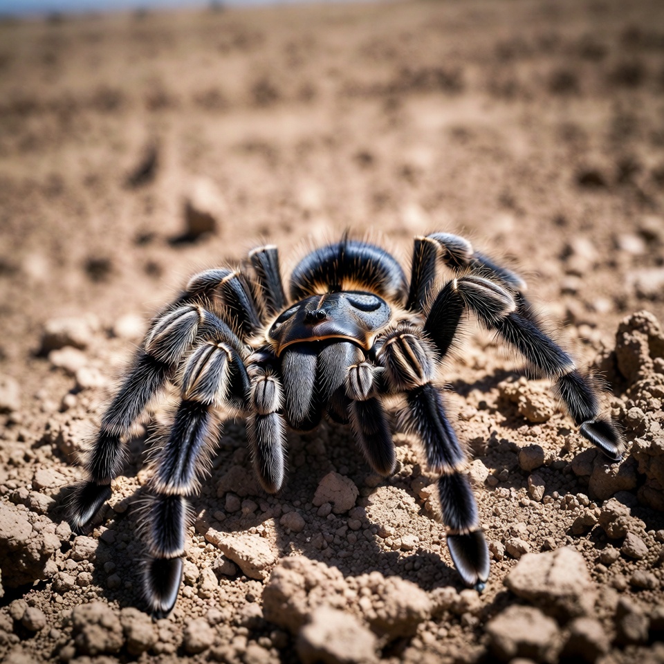 Mexican red knee, animal, arachnid, black legs, closeup, cracked soil, dirt ground, eight legs, fangs, fuzzy body, hairy spider, isolated background, macro photo, outdoors, pedipalps, red knees, spider, white stripes, wildlife, tarantula