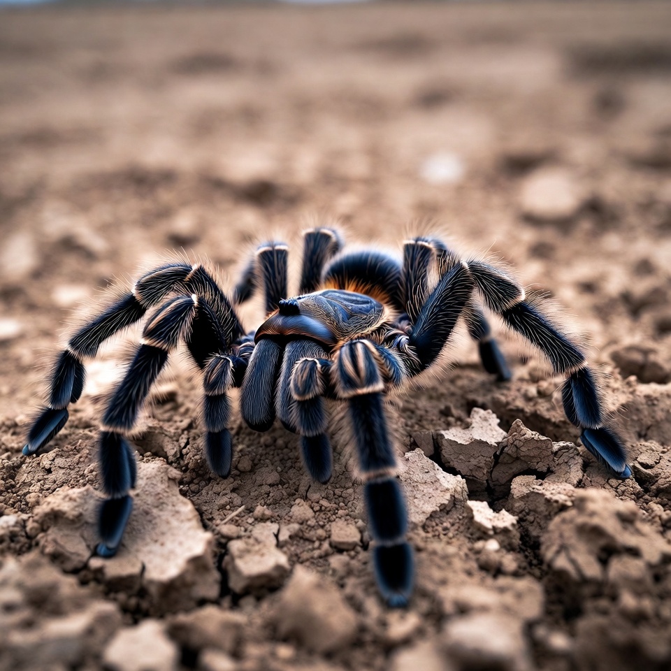 animal, arachnid, arthropod, black legs, blue tarantula, closeup, cracked earth, desert, fangs, ground, hairy legs, isolated background, macro, orange markings, soil, spider, wildlife, tarantula