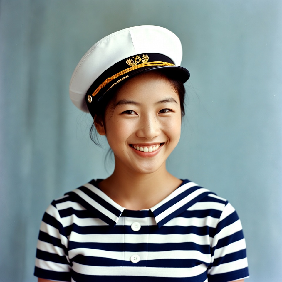 A young Asian girl with short dark hair smiles happily while wearing a white naval cap with gold braid and a navy blue striped sailor dress. She stands against a plain light blue background. Her expression is cheerful with bright eyes and a wide smile.