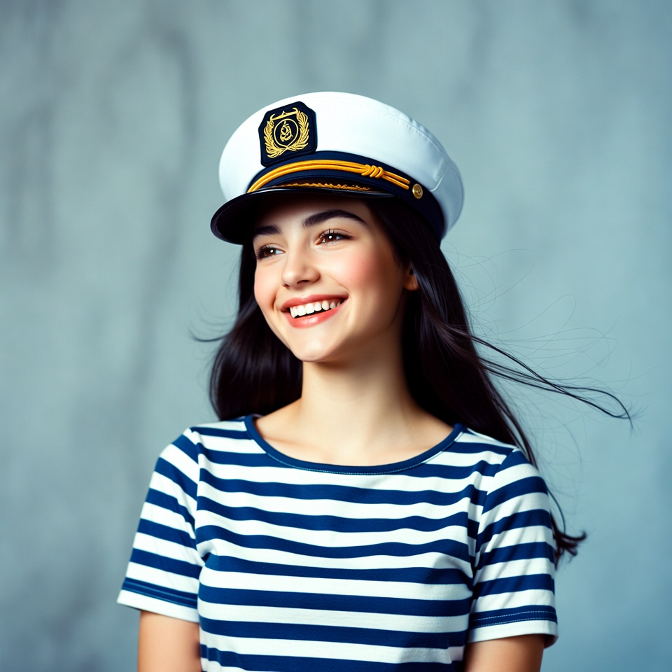 A young woman with long dark hair smiles happily while wearing a white captain's hat with gold emblem. She is dressed in a striped navy and white sailor shirt. The image features a plain blue background.