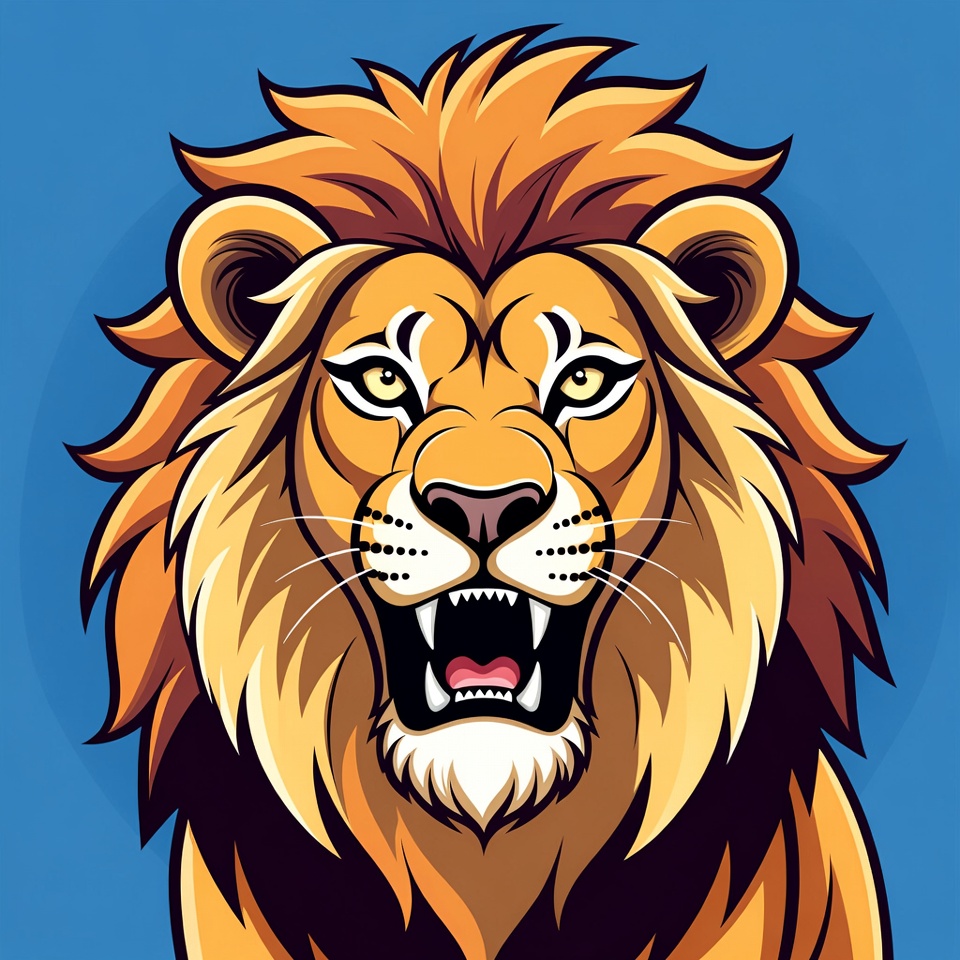 A vibrant cartoon lion with a large orange mane roars fiercely on a solid blue background. Its yellow eyes are wide open, and sharp white teeth are visible in its open mouth. The illustration features bold outlines and dynamic fur details.