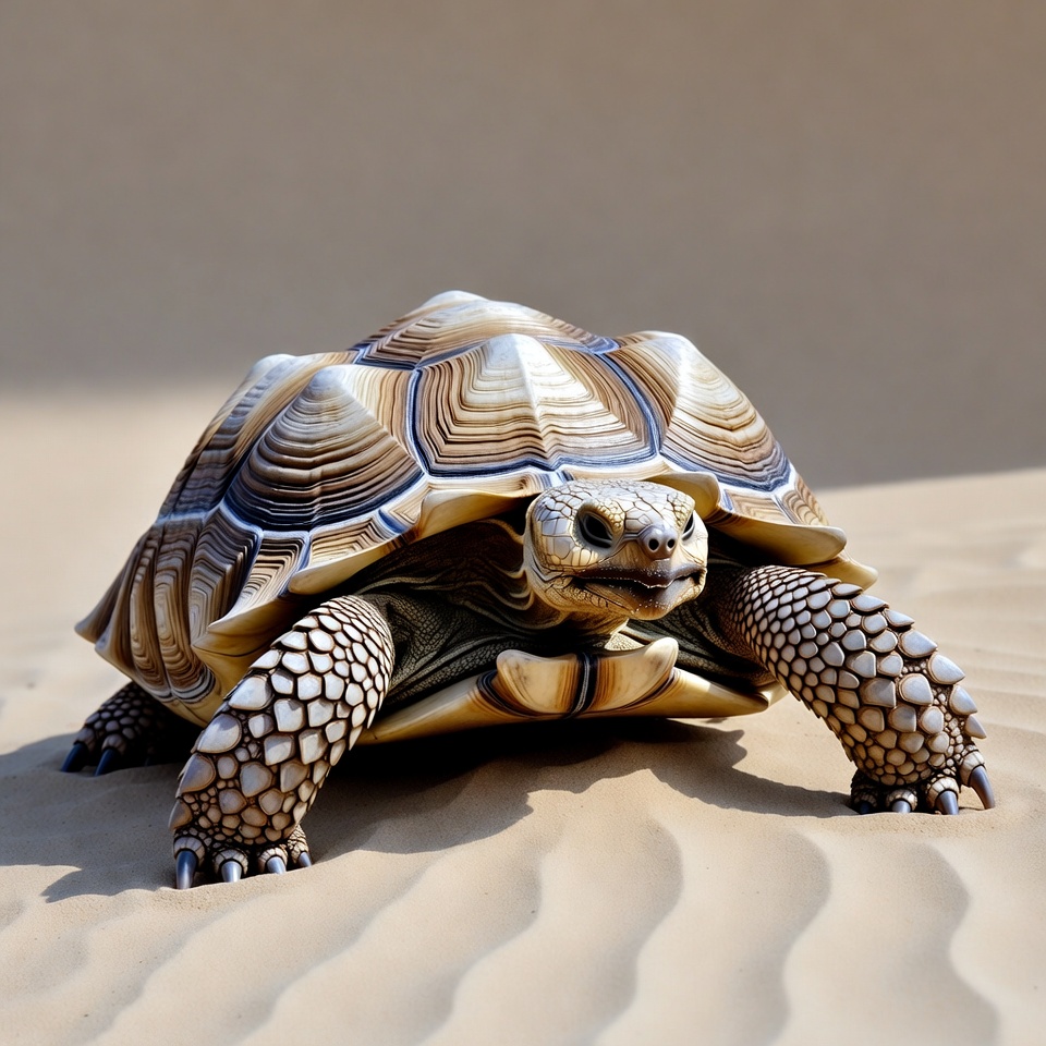 A radiated tortoise with intricate brown, yellow, and black shell patterns stands on a sandy surface. Its textured legs and head are prominently visible in a front-facing pose. The tortoise appears detailed and realistic against the neutral beige background.