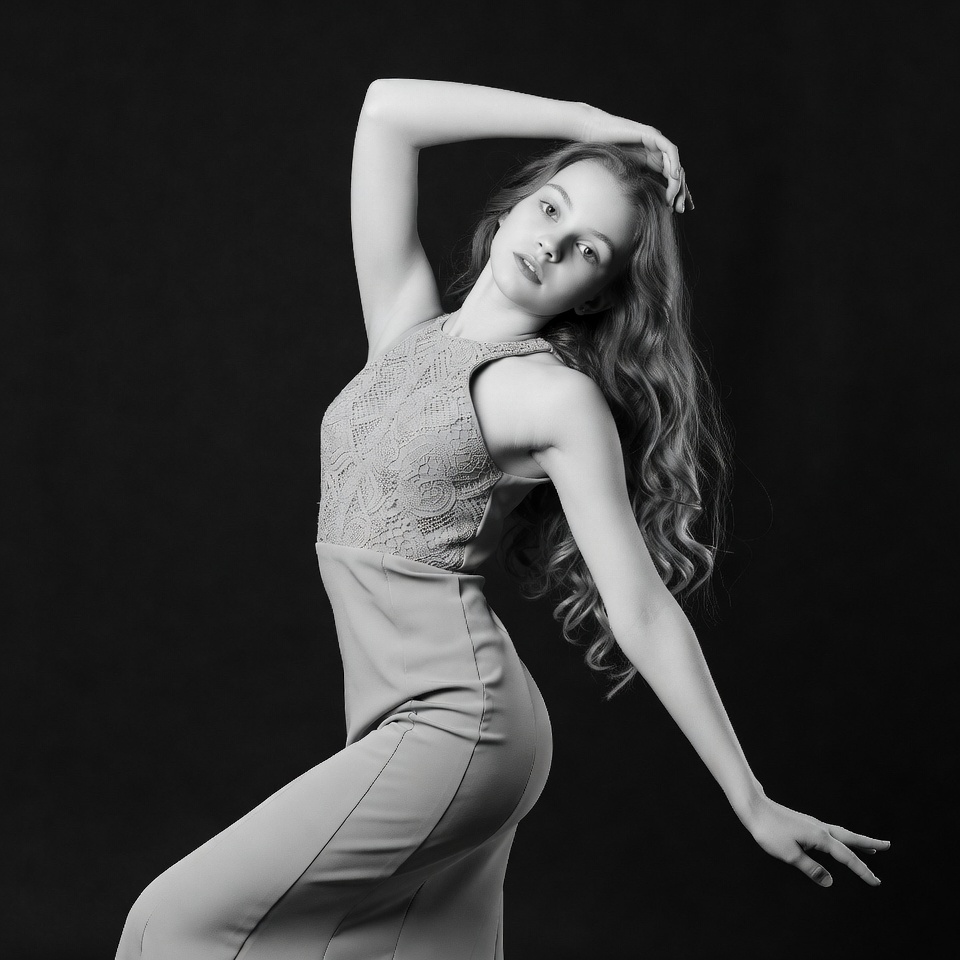 White, arm raised, black and white, black background, bodycon dress, dance pose, dancer, elegant, extended arm, fashion pose, female, figure pose, graceful pose, hand on head, lace dress, long hair, monochrome, portrait, posing, sleeveless dress, studio photo, wavy hair, young woman, woman
