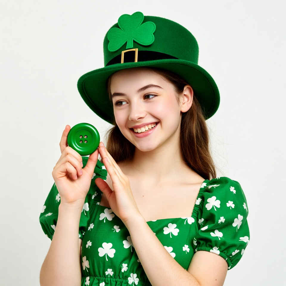 A young girl with long brown hair smiles while wearing a large green felt hat adorned with shamrocks. She holds a green shamrock-shaped button in her hand and wears a green dress patterned with shamrocks. The image features a solid white background.