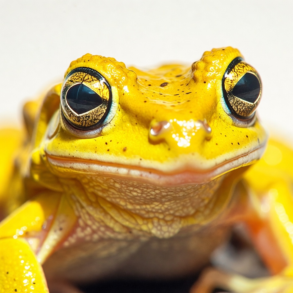 amphibian, animal, black eyes, bumpy skin, close-up, exotic frog, frog, golden yellow, isolated background, large eyes, macro photo, nature, textured skin, vibrant colors, wildlife, yellow frog