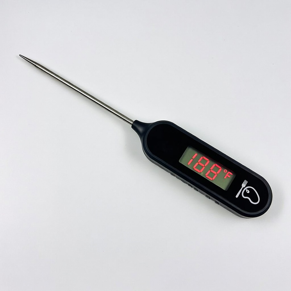 188°F, BBQ thermometer, LCD display, black handle, cooking thermometer, digital thermometer, food thermometer, grilling tool, isolated, kitchen tool, probe thermometer, red digits, stainless steel probe, white background, meat thermometer