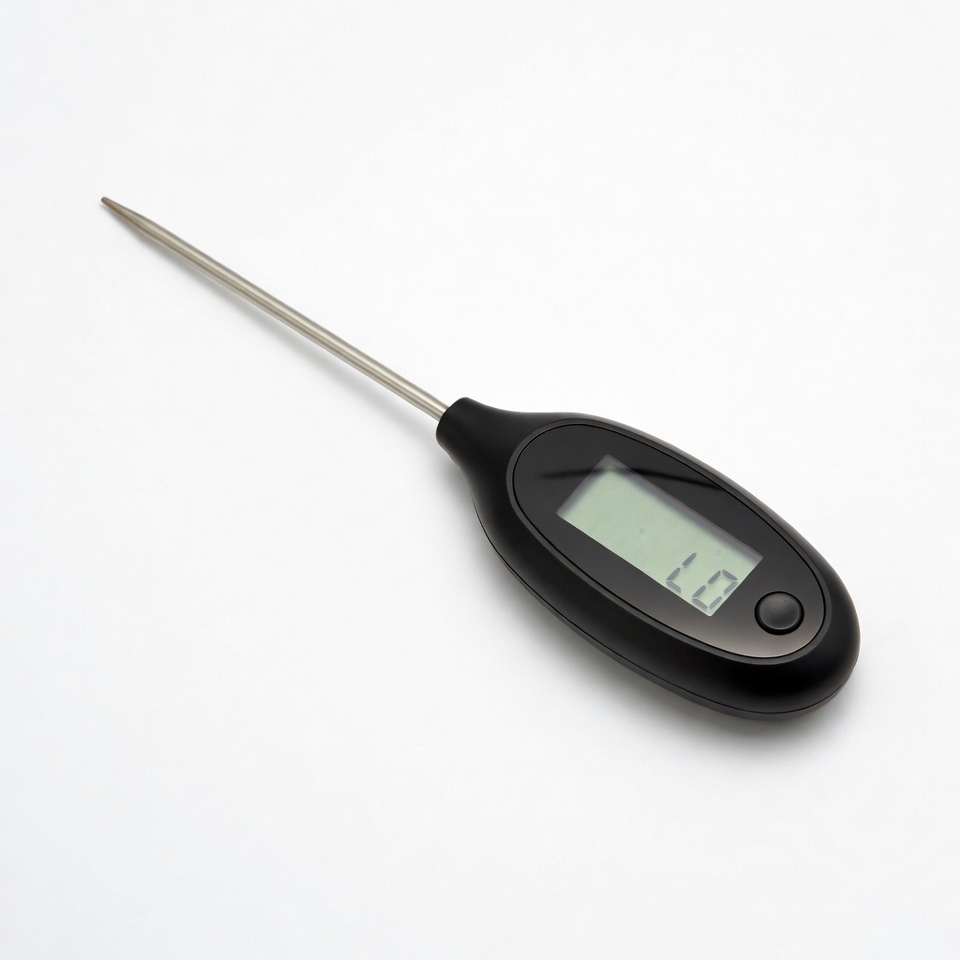 LCD display, black handle, cooking thermometer, digital thermometer, food thermometer, instant read thermometer, isolated background, kitchen thermometer, probe thermometer, stainless steel probe, white background, meat thermometer