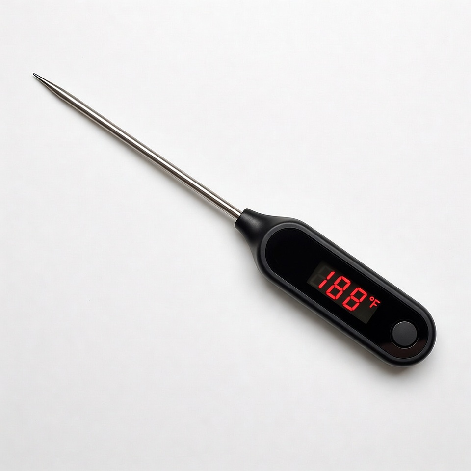 188°F, LCD display, black handle, cooking thermometer, digital thermometer, food thermometer, grilling tool, instant read, isolated background, kitchen tool, probe thermometer, red numbers, stainless steel probe, thermometer reading, meat thermometer