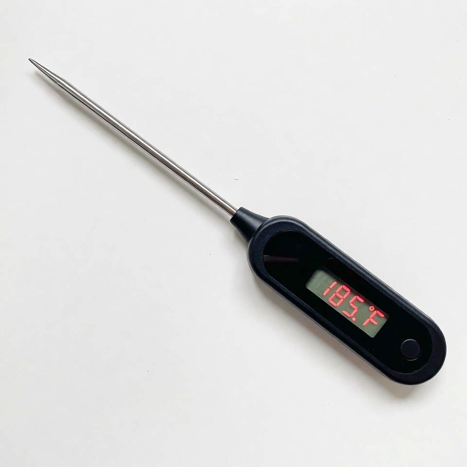 195F, BBQ thermometer, LCD display, black handle, cooking thermometer, digital thermometer, food thermometer, grilling tool, instant read, isolated background, kitchen tool, probe thermometer, stainless steel probe, temperature gauge, white background, meat thermometer