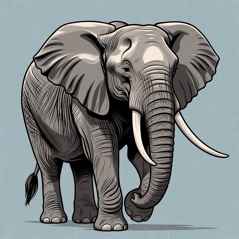 A detailed line art illustration of a majestic elephant with large tusks and flapping ears stands on a light blue background. The elephant faces forward with its trunk raised and tail extended. The artwork features intricate shading and contours in grayscale tones.