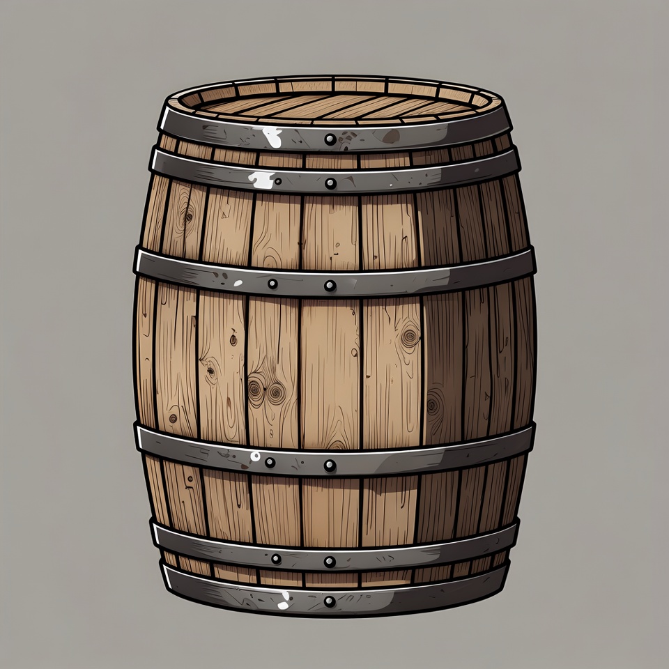 A detailed illustration of a wooden barrel with metal hoops stands on a gray background. The barrel features textured brown wood planks and silver-gray bands with rivets. It is depicted in a cartoon style with clean line art.