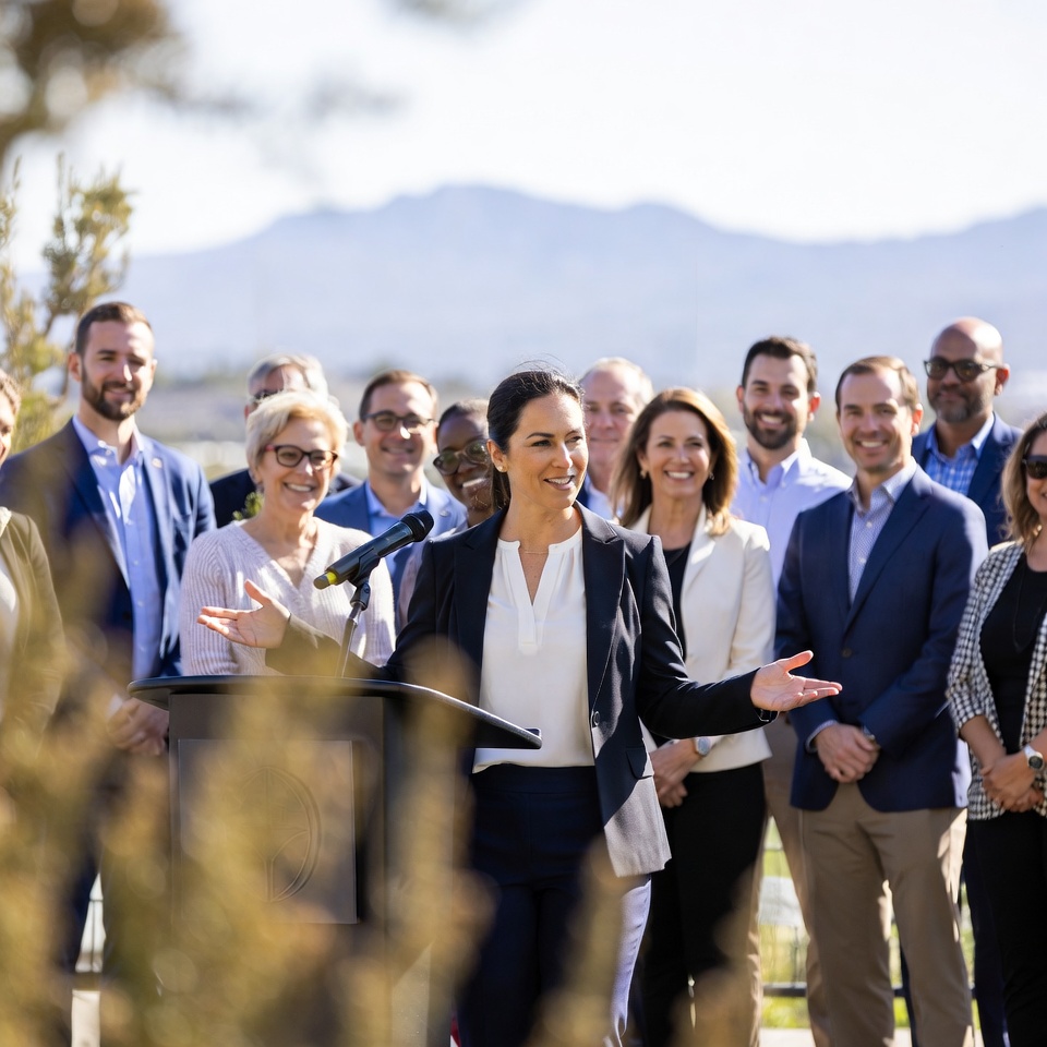 African-American, Latino, White, audience, blouse, bushes, business suit, conference, diverse group, formal wear, gesturing, group photo, men, microphone, mountains, outdoor event, podium, professional attire, skirt, smiling, speech, suit jacket, sunny day, women, woman speaking
