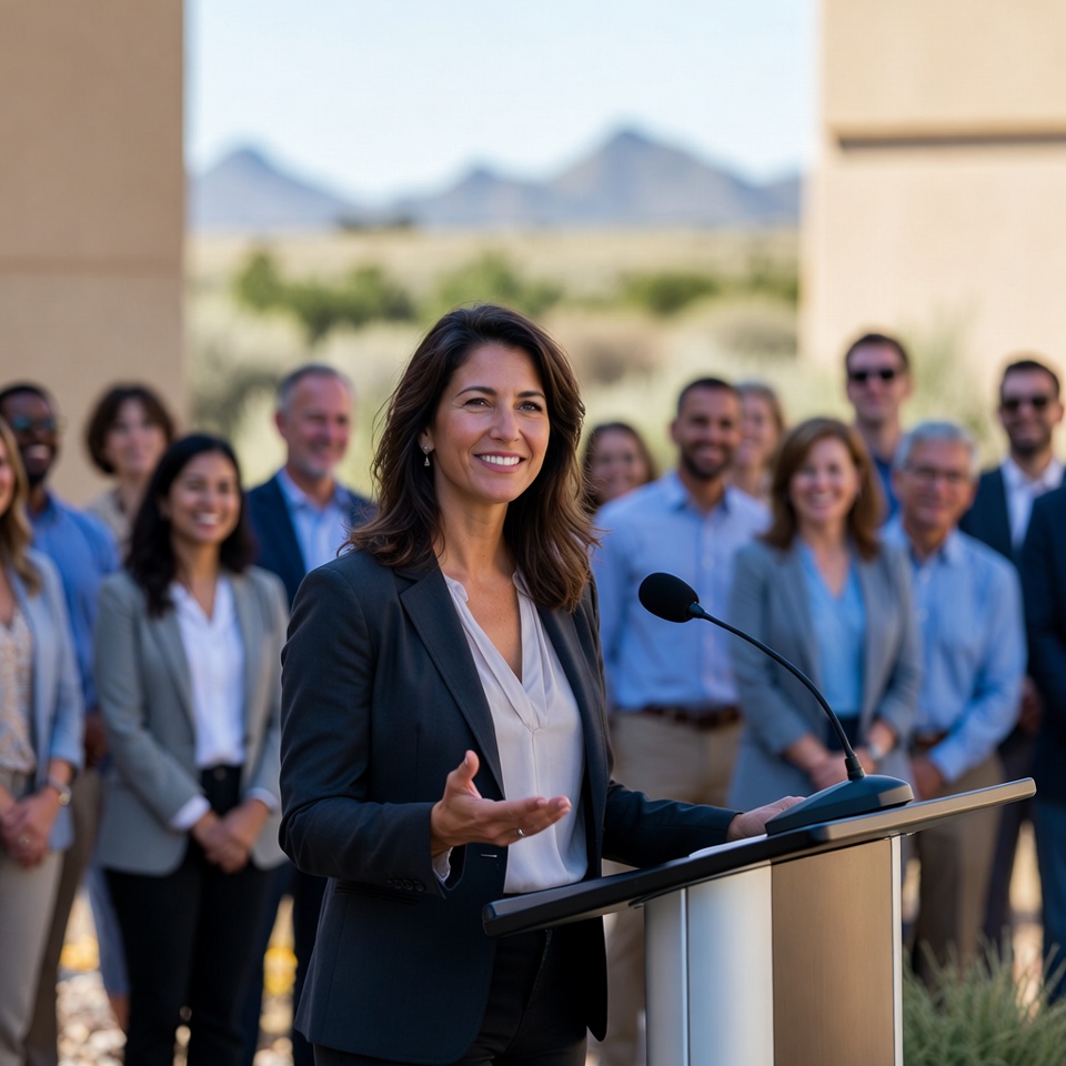 A smiling woman in a dark blazer and white blouse speaks at a podium with a microphone, gesturing with her hand. A diverse group of professionals in business attire stands behind her on an outdoor platform. Desert mountains and arches are visible in the background under a clear sky.