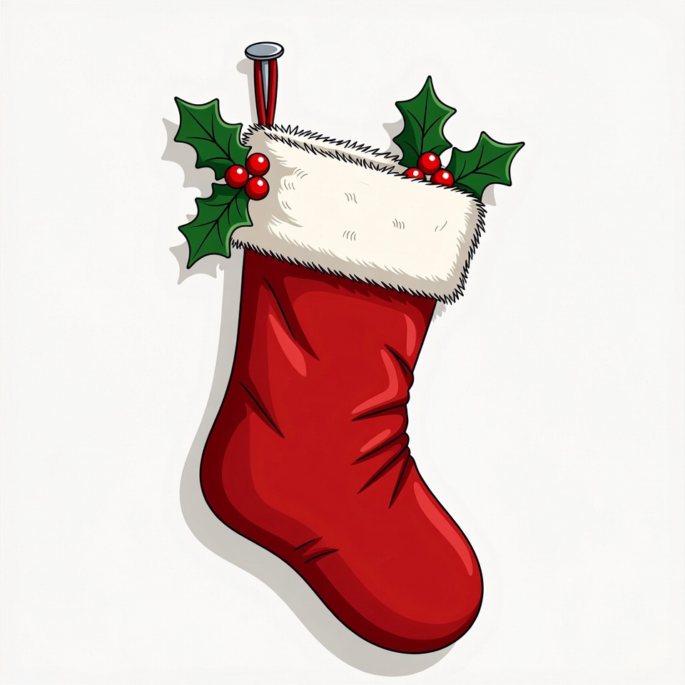 A vibrant red Christmas stocking hangs with white faux fur trim around the top. It is decorated with clusters of green holly leaves and red berries on both sides. The illustration features a subtle shadow and is set against a white background.
