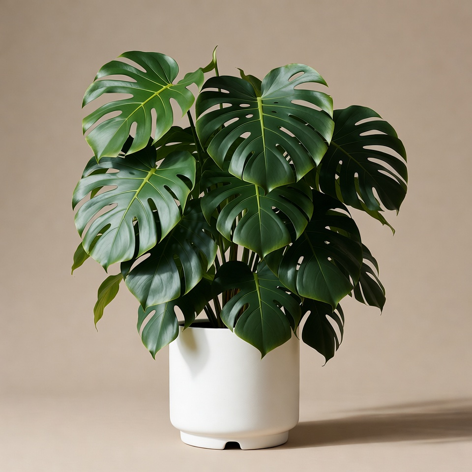 A lush Monstera deliciosa plant with large, green, split leaves sits in a white cylindrical pot. The plant is positioned against a beige background, showcasing its vibrant foliage and healthy growth. The pot has a simple, modern design with a subtle shadow beneath it.