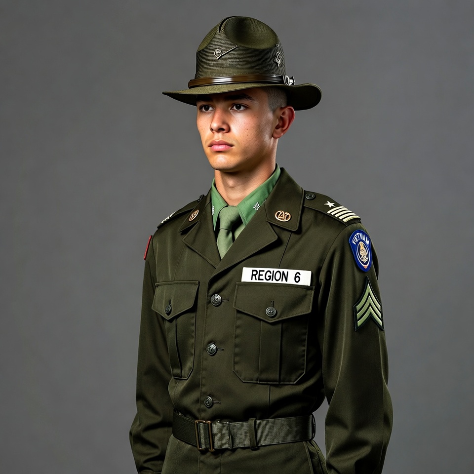 Latino, Region 6, army, belt, cadet, campaign hat, chevrons, drill sergeant hat, epaulets, formal pose, gray background, green uniform, insignia, male, military, patches, soldier, tie, uniform, young man, JROTC