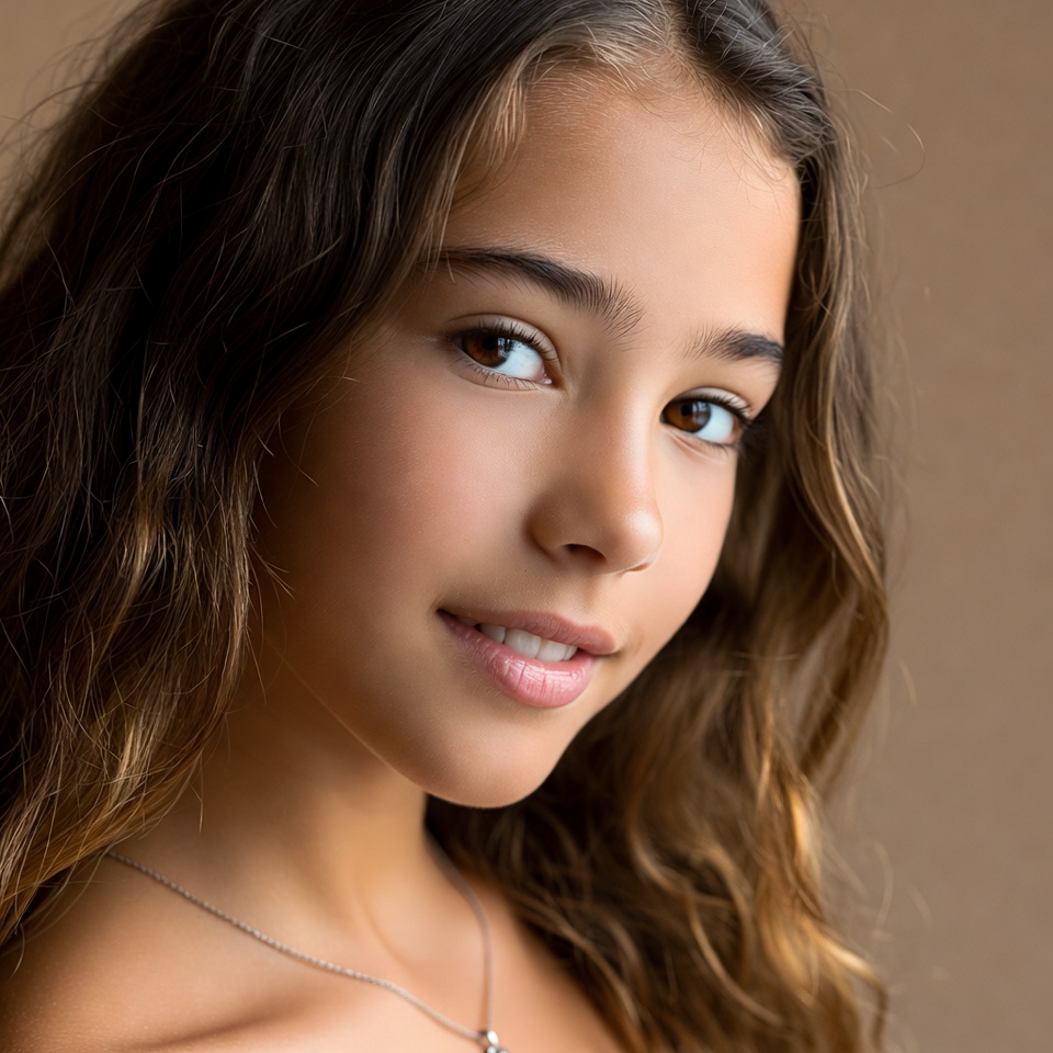 A young woman with long wavy brown hair smiles softly at the camera in a close-up portrait. She has light brown eyes, subtle makeup, and wears a delicate silver necklace with a pendant. Her face is lit against a neutral beige background.