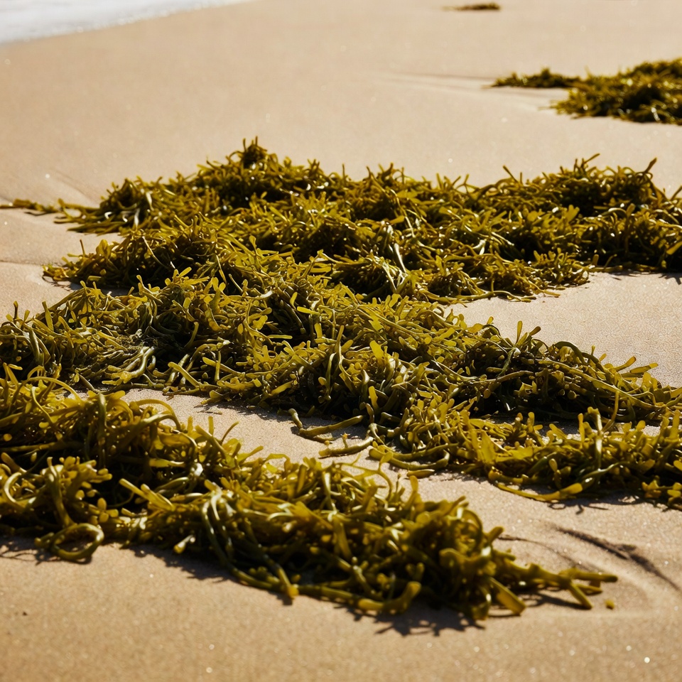 Clumps of green seaweed lie scattered across a sandy beach near the water's edge. The seaweed forms tangled piles with wet, stringy strands contrasting against the light brown sand. Gentle waves lap nearby, leaving subtle foam marks.