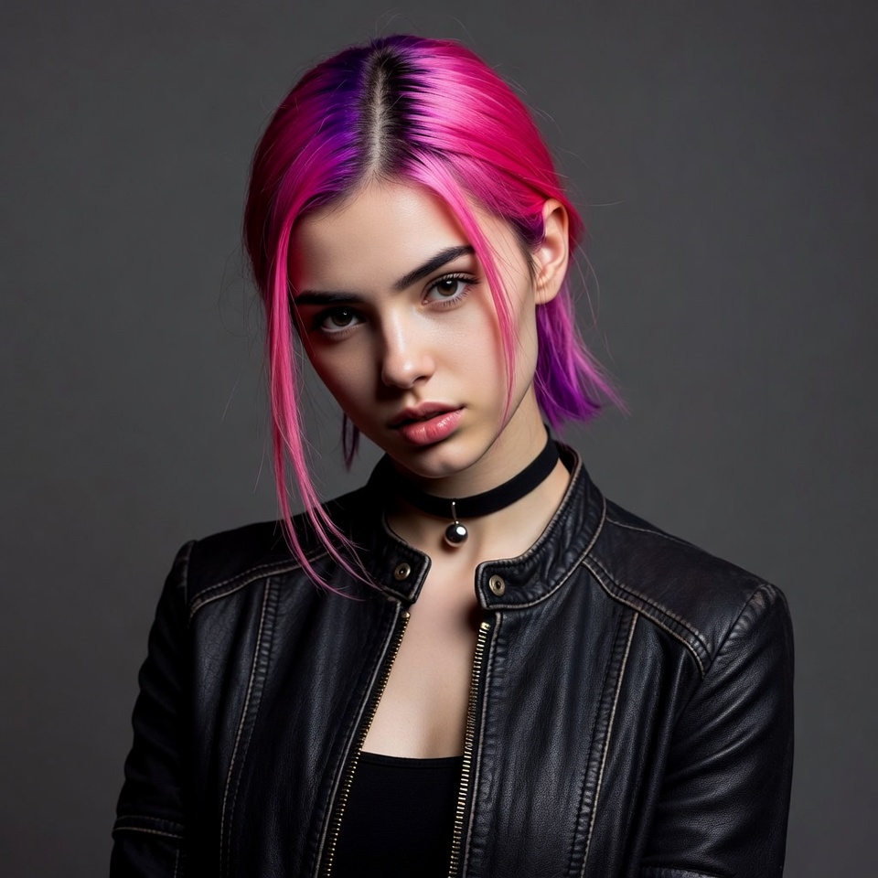A young woman with vibrant pink and purple split-dyed hair stares directly at the camera against a gray background. She wears a black leather jacket over a top and a black choker necklace with a pendant. Her expression is neutral with subtle makeup.