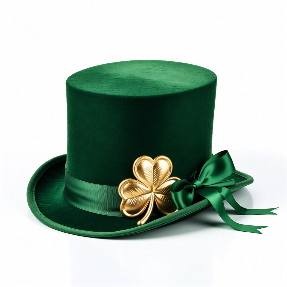 A green velvet top hat features a wide brim edged in green ribbon. A large gold shamrock pin is attached to the side, accented with a matching green bow. The hat is isolated on a white background.
