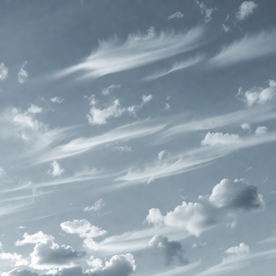 A sky filled with wispy white cirrus clouds stretches across a pale blue expanse. Thin, feathery streaks of clouds intersperse with scattered fluffy cumulus formations. The overall scene features a serene, layered cloudscape.