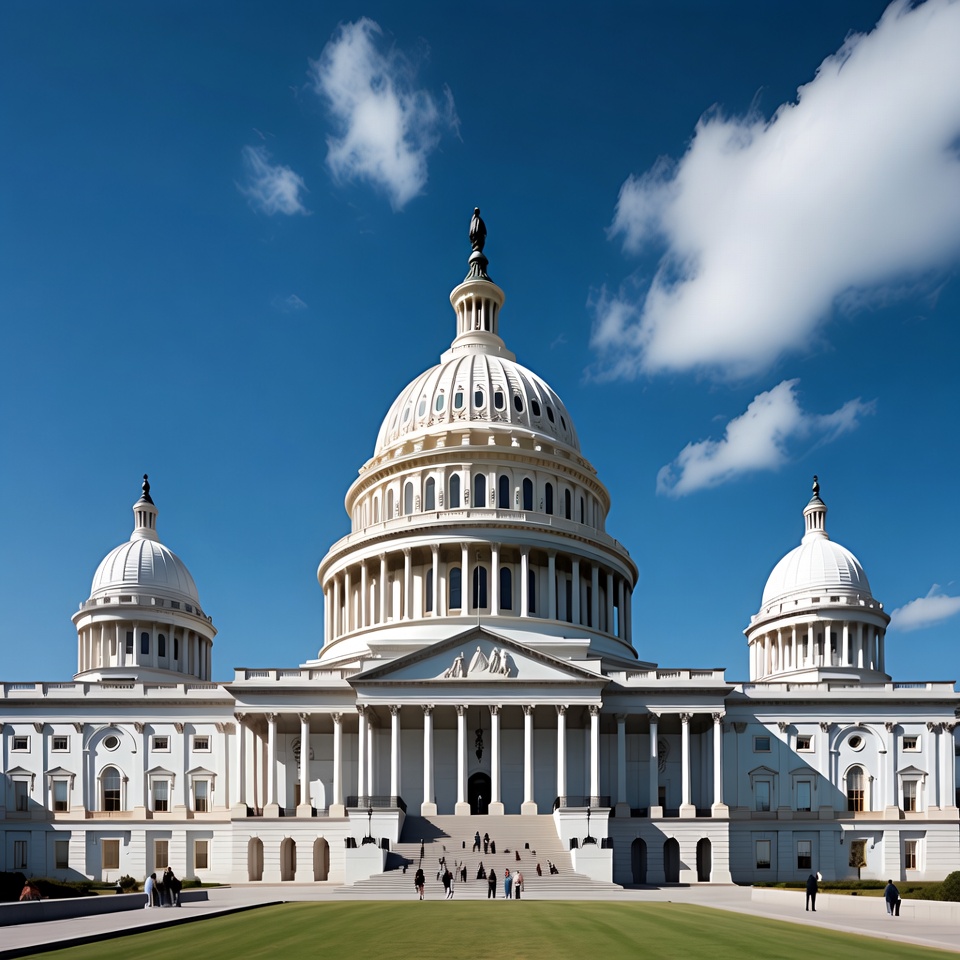 The iconic white US Capitol Building stands prominently under a clear blue sky with scattered white clouds. Its central dome and flanking wings feature columns and statues. A small group of people walks on the steps and green lawn in front.