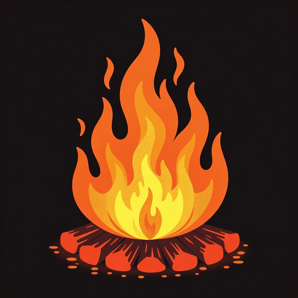 A vibrant cartoon illustration of a campfire with tall orange and yellow flames rising from a circle of red logs. The flames flicker dynamically against a solid black background. The style is simple and bold, perfect for icons or graphics.