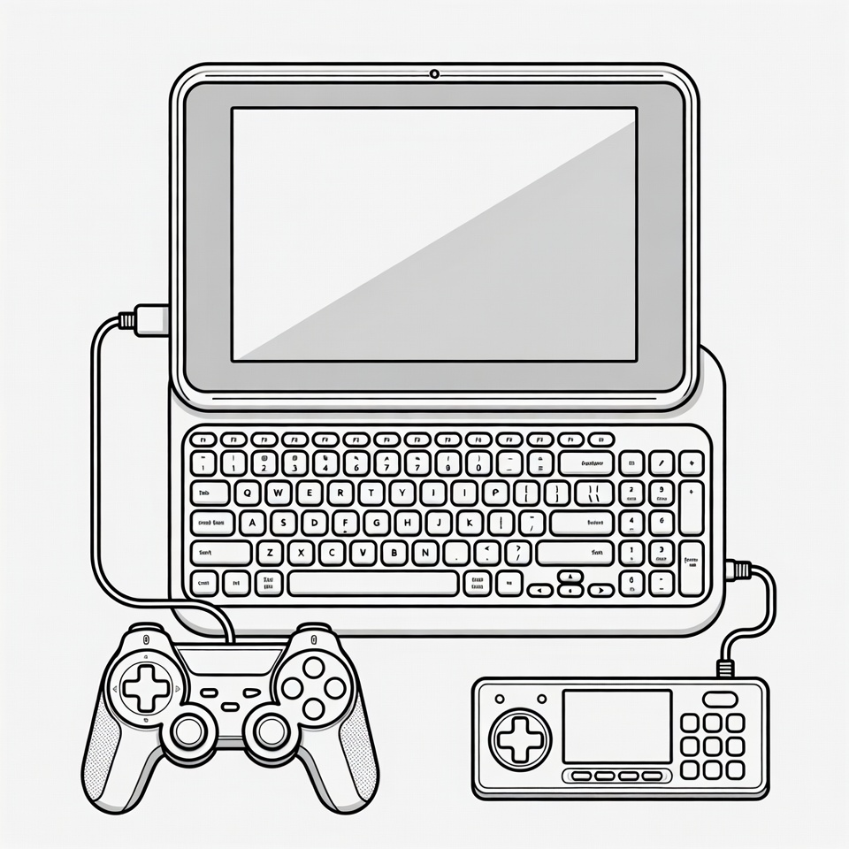 DualShock, PlayStation controller, USB cable, clipart, computer, console controller, gamepad, gaming device, gaming setup, illustration, isolated background, keyboard, line art, screen, laptop