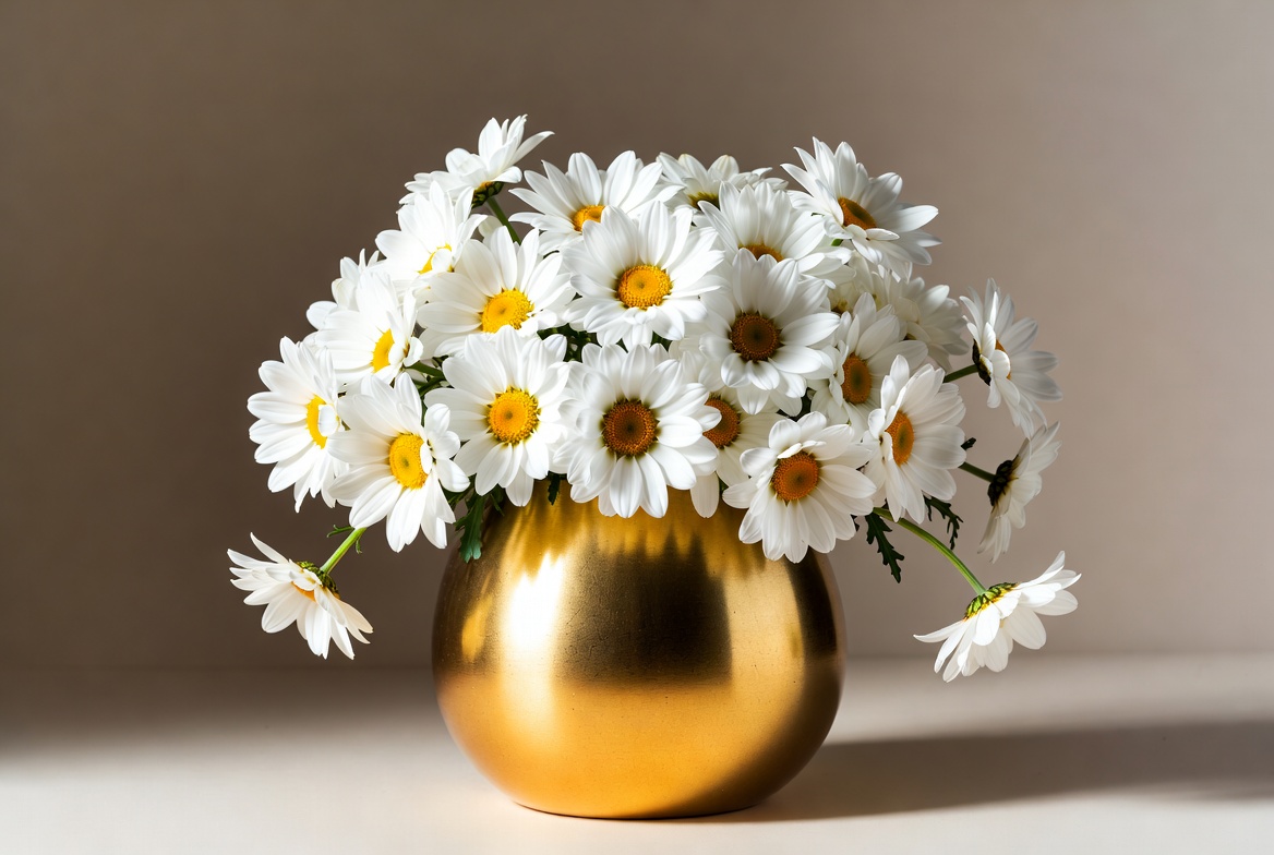 A bouquet of white daisies with yellow centers is arranged in a shiny gold vase. The flowers are fresh and full, with green stems and leaves visible. The vase sits on a light neutral background.