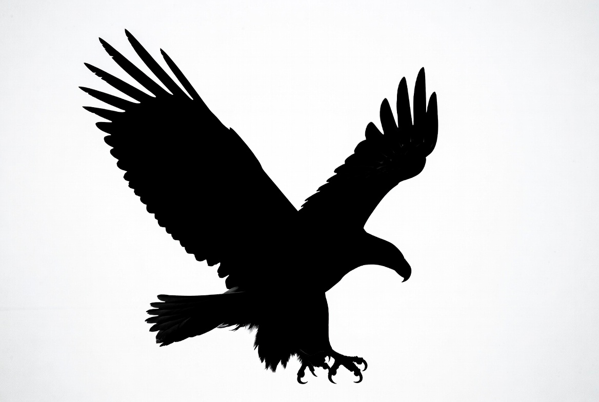 A black silhouette of a bald eagle with wings spread wide in flight. The detailed outline shows sharp talons, feathers, and a prominent beak. It is isolated on a white background.