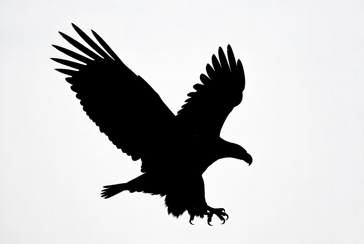 A black silhouette of a bald eagle in flight against a white background. The eagle has wide spread wings, detailed feathers, a prominent beak, and talons extended. It is depicted in a dynamic soaring pose.