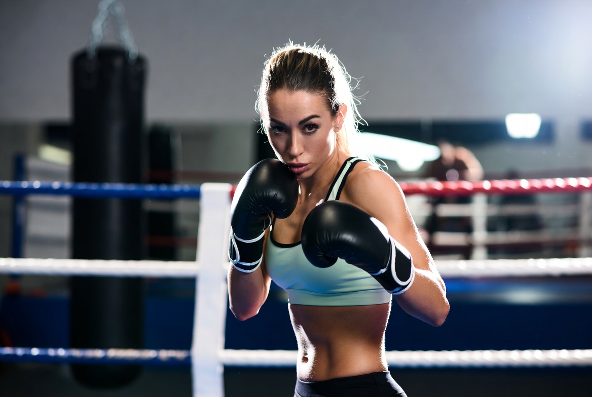 A fit White woman with blonde hair in a ponytail stands in a boxing ring wearing a light green sports bra, black shorts, and black boxing gloves. She poses with gloves raised in a fighting stance amid punching bags and blue ropes. The gym setting features dramatic lighting highlighting her toned midriff.