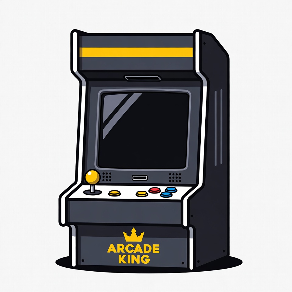 80s style, Arcade King, arcade cabinet, black cabinet, blank screen, buttons, clipart, crown logo, game machine, gaming, illustration, isolated background, joystick, retro arcade, vector art, vintage arcade, yellow panel, arcade machine