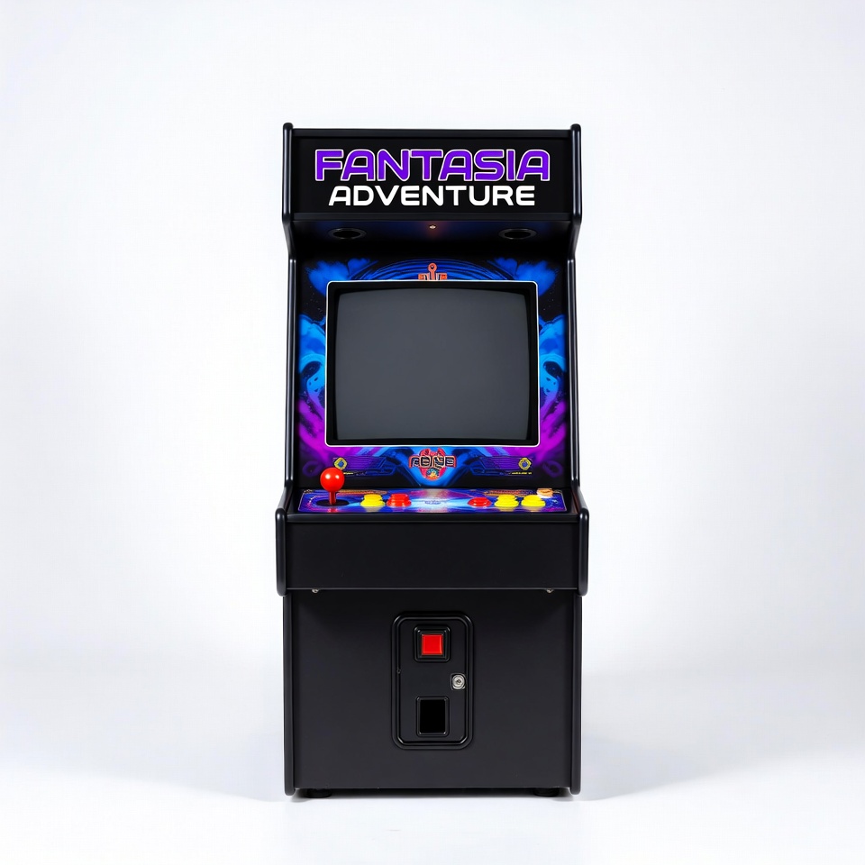 Fantasia Adventure, arcade cabinet, black cabinet, blue graphics, buttons, control panel, flame patterns, gaming console, isolated background, joystick, neon lights, purple design, retro gaming, video game, arcade machine
