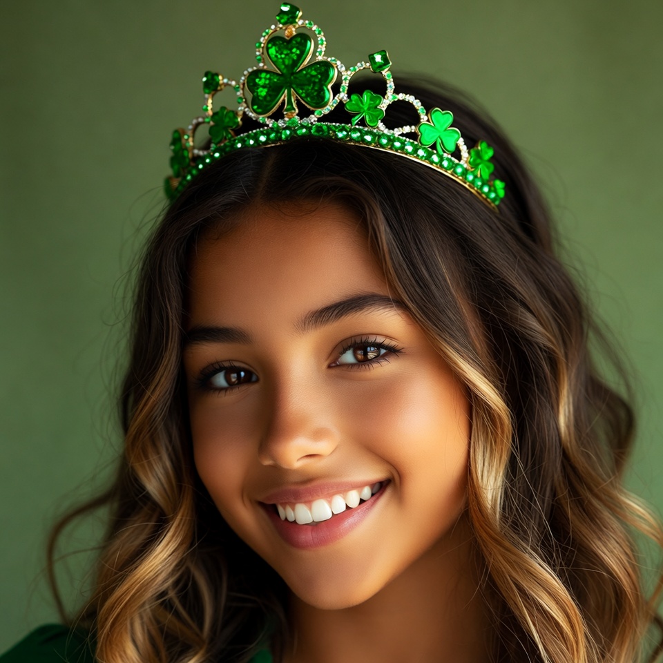 A young girl with wavy brown hair and a bright smile wears a sparkling green tiara adorned with shamrock and emerald gems. She has a smooth, glowing complexion and looks directly at the camera. The background is a solid light green.