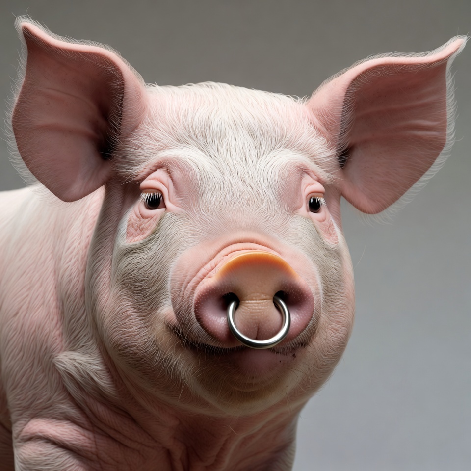 animal eyes, animal portrait, cute pig, ears, farm animal, floppy ears, gray background, livestock, nose ring, piercing, pink pig, silver ring, snout, white pig, pig