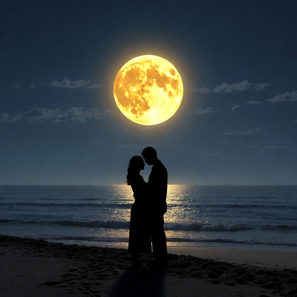 A silhouette of a man and woman embracing on a sandy beach at night with a large full moon rising in the sky. Gentle ocean waves lap at the shore behind them, and scattered clouds frame the bright yellow moon. The dark night sky contrasts with the glowing moon and reflective water.