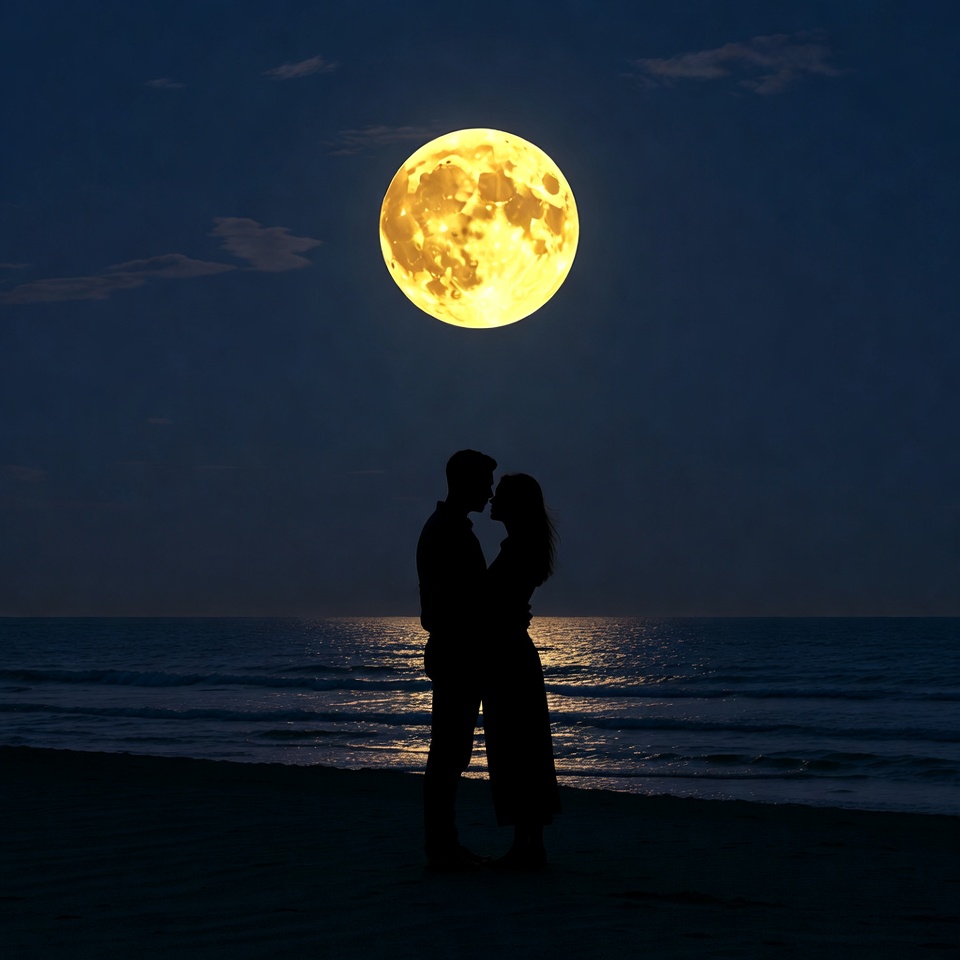 A silhouette of a man and woman embracing on a sandy beach at night. A large bright full moon hangs in the dark sky above them. Calm ocean waves reflect the moonlight in the foreground.