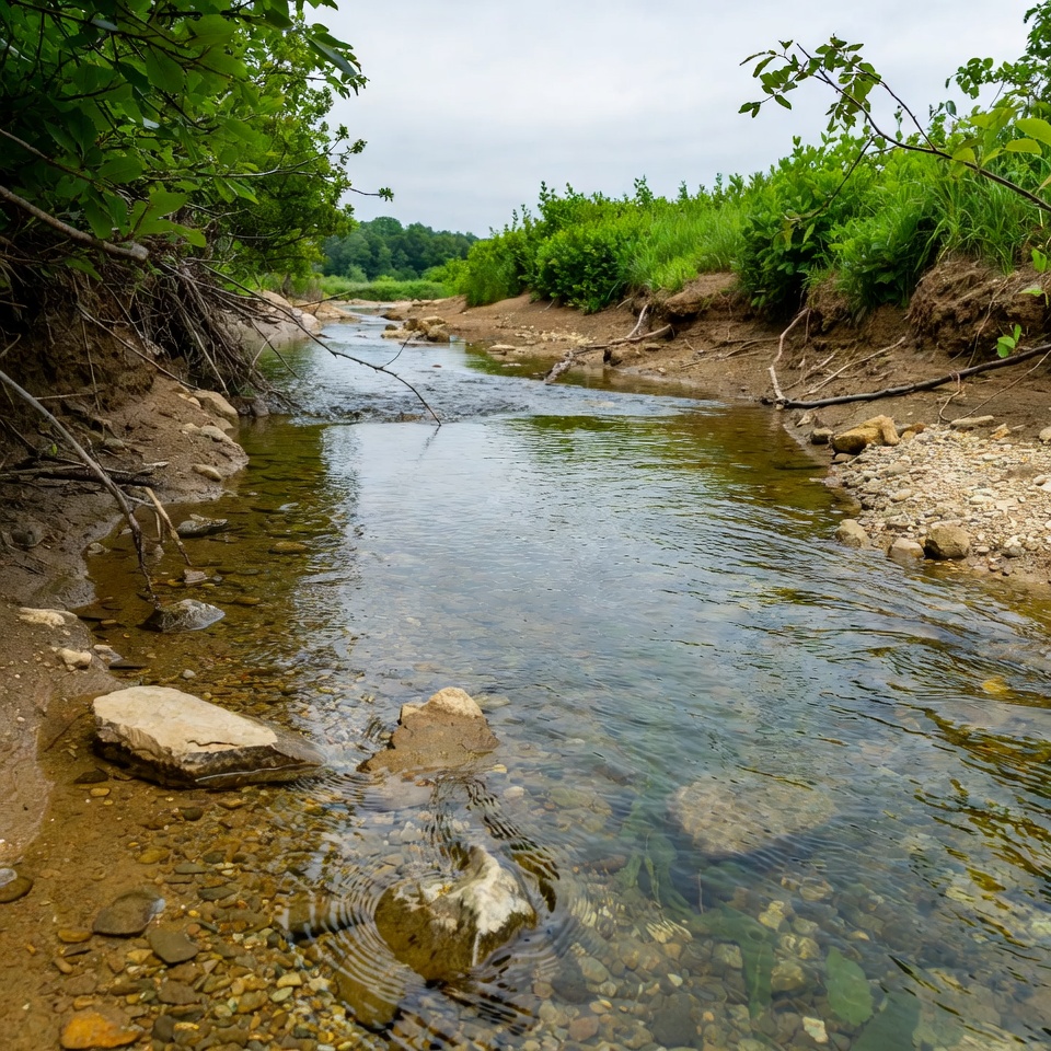 branches, bushes, clear water, cloudy sky, earth, flowing water, foliage, forest, green vegetation, lush greenery, natural landscape, nature, outdoors, pebbles, riparian area, ripples, river, riverbank, rocks, roots, sand, shallow stream, sunlight, trees, woodland stream, stream