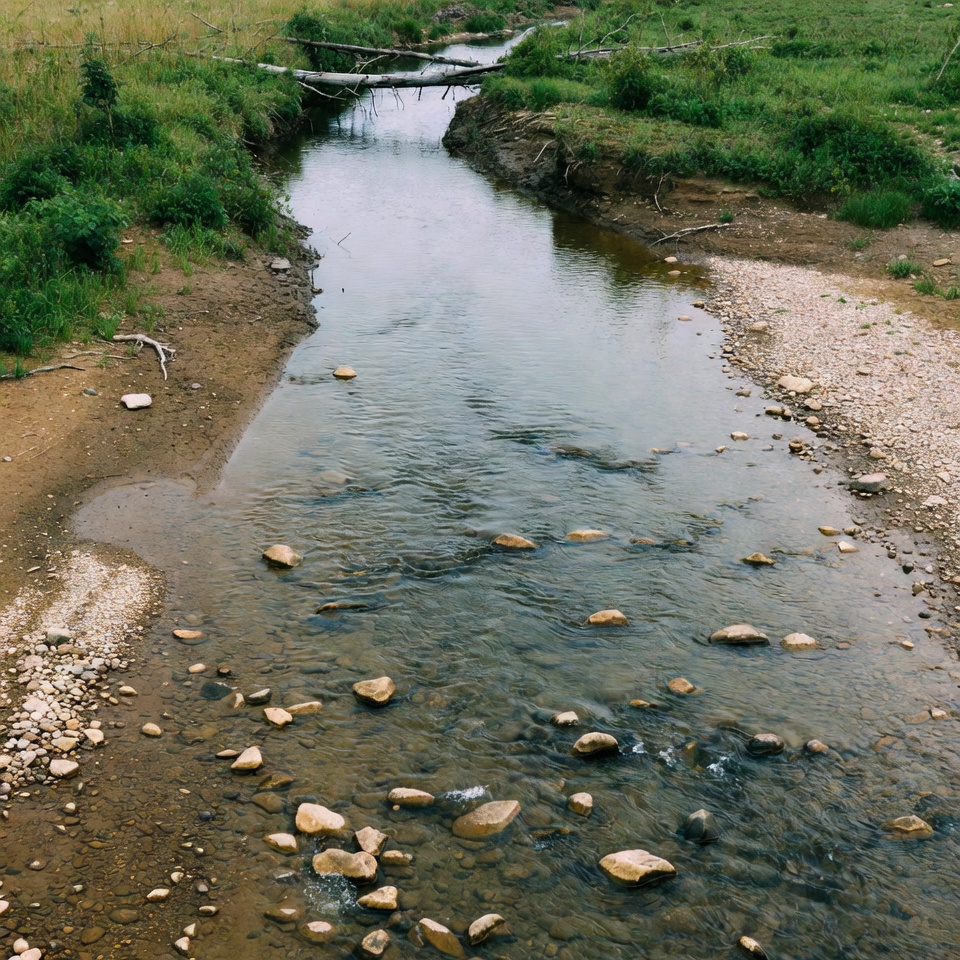 A narrow stream flows gently through a landscape of tall green grass and earthy banks. Smooth pebbles and rocks line the shallow, clear water. Wooden debris spans part of the stream amid surrounding vegetation.